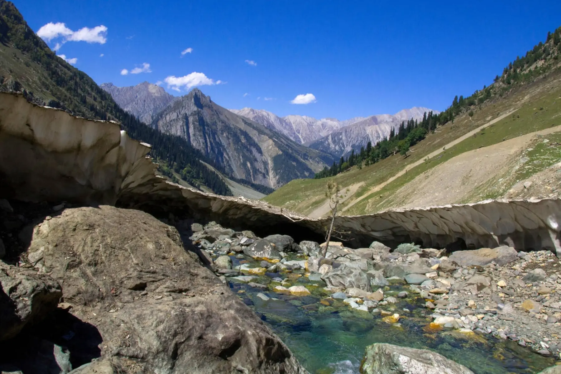 Beyond its adventurous spirit, Sonmarg’s tranquil charm resonates deeply with spiritual travelers. It serves as the base camp for the Amarnath Cave Pilgrimage — a revered Hindu site — drawing devotees from around the world. The journey through rugged mountain paths and snowfields adds a sense of devotion intertwined with nature’s grandeur. For those seeking peace, the Baltal Valley, just 15 km away, is a serene camping site along the Sindh River, offering an untouched slice of Kashmir’s raw beauty. Whether you’re meditating by a riverside, exploring offbeat trails, or simply soaking in the views, Sonmarg blends spirituality, serenity, and adventure seamlessly.